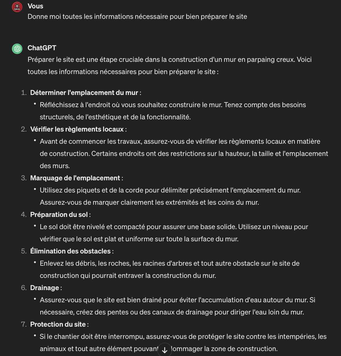 Nous allons essayer de rédiger du contenu avec ChatGPT concernant la réalisation d’un muret en parpaing creu en béton. Vous vous rendez donc sur chatGPT et vous commencez à rédiger la question suivante « Comment monter un muret en béton ? ». Généralement, lorsque vous posez une question relativement vague ou trop général, la réponse donnée par ChatGPT sera également générale et vague. Par contre, si vous lui demander « quelles sont les étapes pour construire un muret en parpaing en béton »? Il vous listera toutes les étapes. Ensuite à vous de demander à ChatGPT de détailler chaque étape en profondeur.